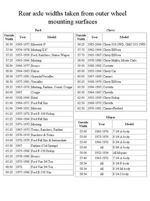 Cougar thunderbird and 1996 and up explorer rears at 59 34 inches will fit under 1940 52 mopars and 1947 55 chevy pickups. When swapping an explorer 88 inch axle in to a 4wd ranger you need move the spring perches to the top of the axle tube.
